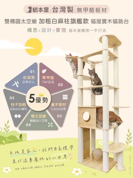 貓本屋 台灣製 旗艦款 雙橢圓太空艙加粗白麻柱貓屋實木貓跳台(附劍麻抓板/球)