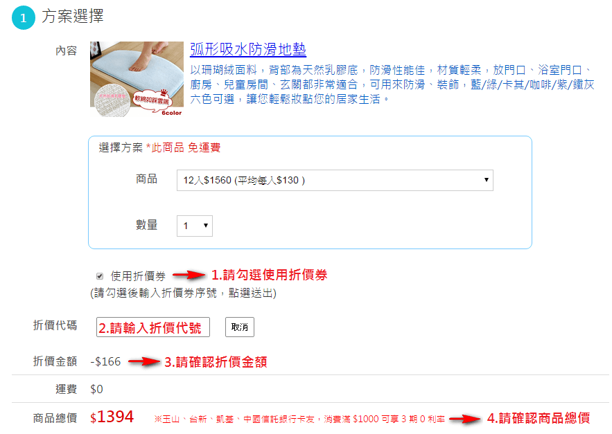 結帳時,請依下圖步驟使用折價券: