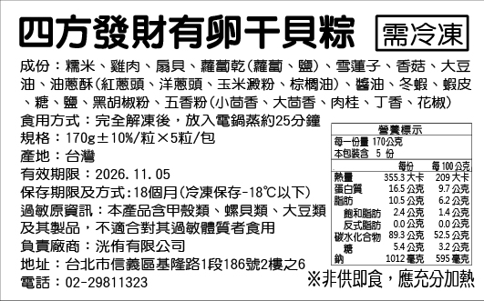 成分:圓糯米、雞肉、扇貝、蘿蔔乾(蘿蔔、鹽)、雪蓮子、香菇、大豆油、油蔥酥(紅蔥頭、醬油、冬蝦、糖、鹽、黑胡椒粉、五香粉、(小茴、肉桂、大茴、丁香、花椒)。