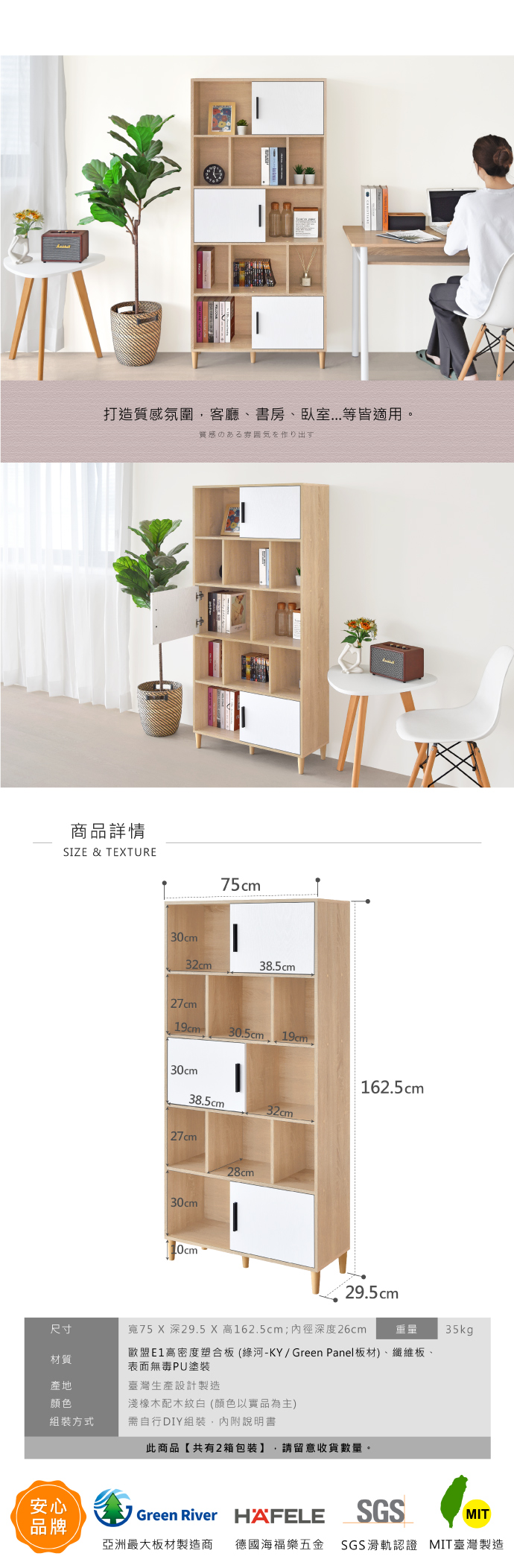⭐️合馬家具為100%使用【E1低甲醛與無毒塗裝】的專業DIY家具製造商⭐️◎商品名稱:《HOPMA》造型三門五層收納書櫃◎材質:歐盟E1高密度塑合板(綠河-KY/Green Panel)、纖維板、表面無毒PU塗裝◎尺寸:寬75 X 深29.5 X 高162.5 cm;內徑深度26cm◎產地:台灣生產設計製造◎重量:35公斤◎顏色:淺橡(漂流)木配木紋白◎屬性:DIY商品 (內附組裝說明書)◎是否需要組裝:是◎保存期限:保存期限皆可
