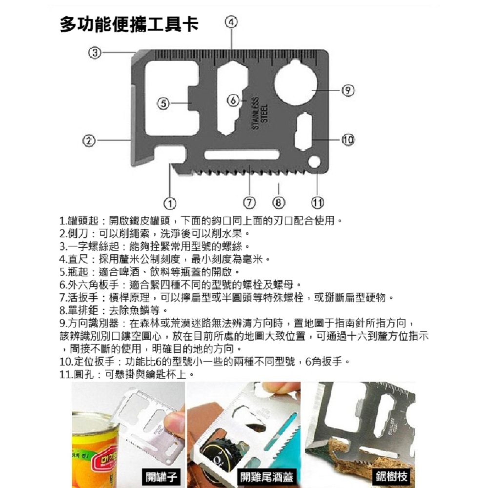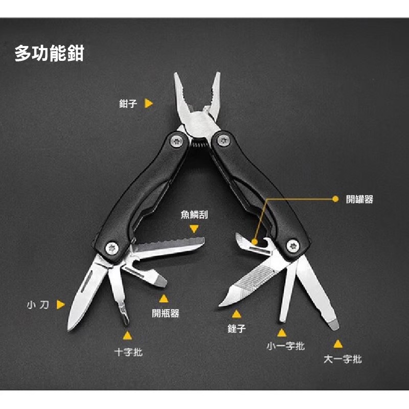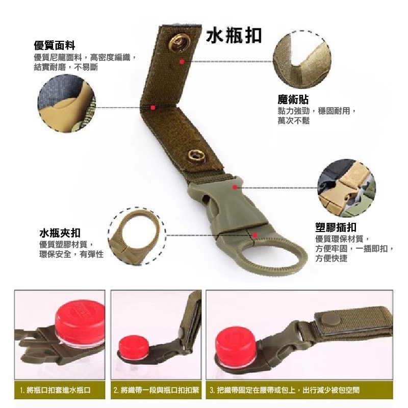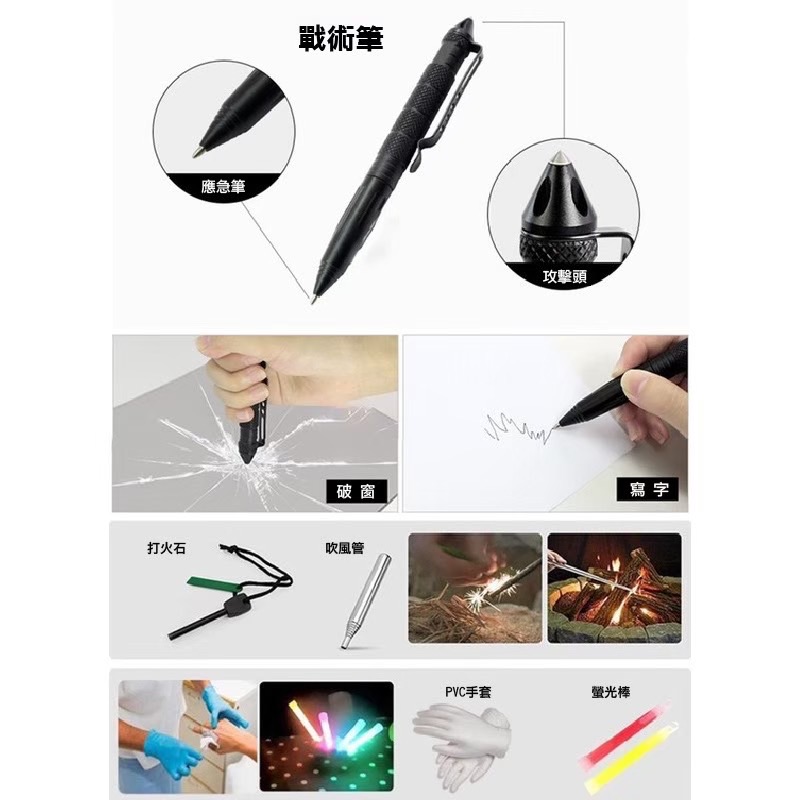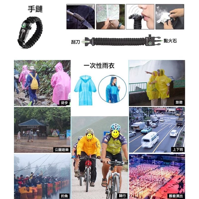 避難包內容:水瓶扣、多功能湯匙叉、多功能鉗子、三頻口哨、打火石、D型扣、繩子、吹風管、加溫毯、乳膠手套、口罩、螢光棒、雨衣、戰術筆、指南針、求生手鍊、手電筒、簡易護理包
