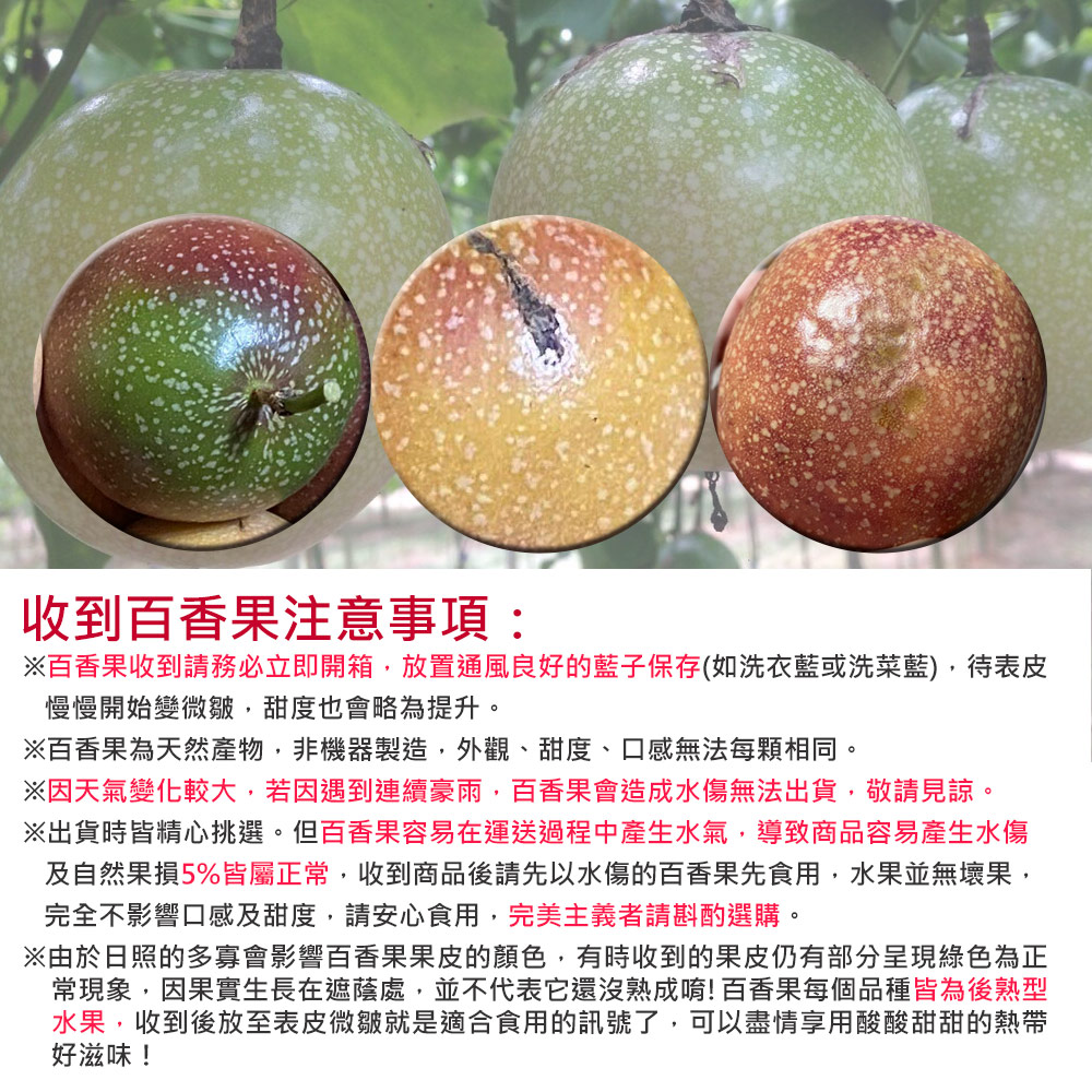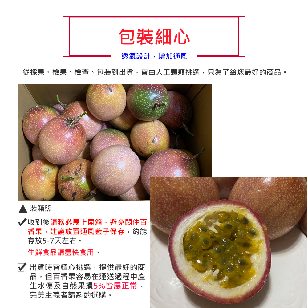 出貨時皆精心挑選。但百香果容易在運送過程中產生水氣,導致商品容易產生水傷及自然果損5%皆屬正常,收到商品後請先以水傷的百香果先食用,水果並無壞果,完全不影響口感及甜度,請安心食用,完美主義者請斟酌選購。