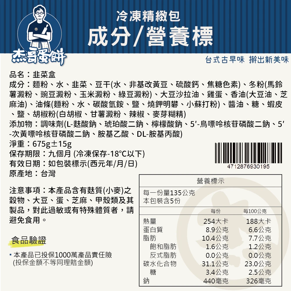 成分:麵粉、水、韭菜、豆干(水、非基改黃豆、硫酸鈣、焦糖色素)、冬粉(馬鈴薯澱粉、豌豆澱粉、玉米澱粉、綠豆澱粉)、大豆沙拉油、雞蛋、香油(大豆油、芝麻油)、油條(麵粉、水、碳酸氫銨、鹽、燒鉀明礬、小蘇打粉)、醬油、糖、蝦皮、鹽、胡椒粉(白胡椒、甘薯澱粉、辣椒、麥芽糊精)