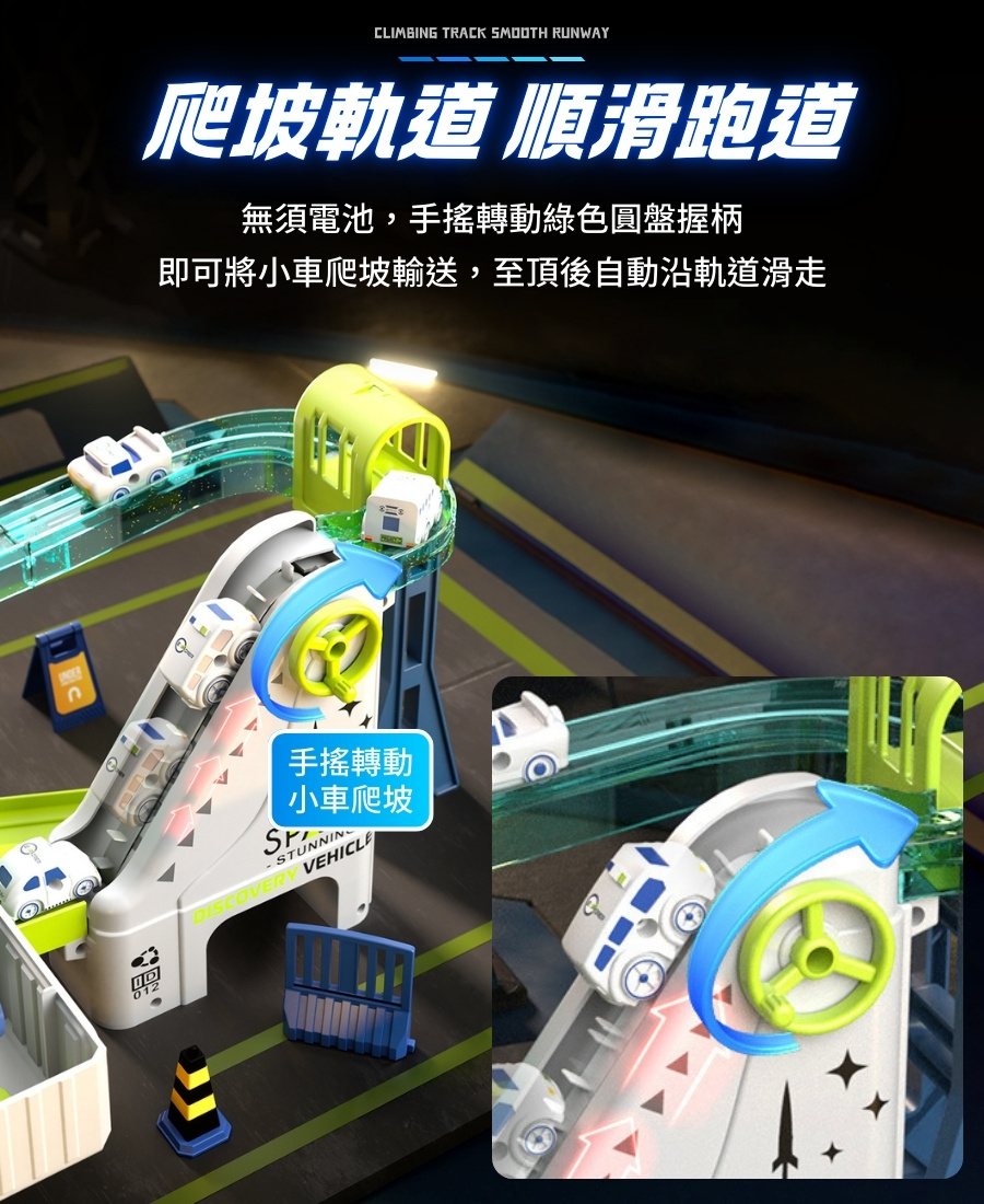 〝爬 坡:無須電池,手遙轉動圓盤握柄、小車即可自動爬坡沿著軌道滑走