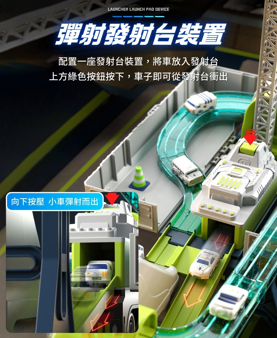 〝發射台裝置:將車放入發射台、上方綠色按鈕按下,即可發射車子衝出