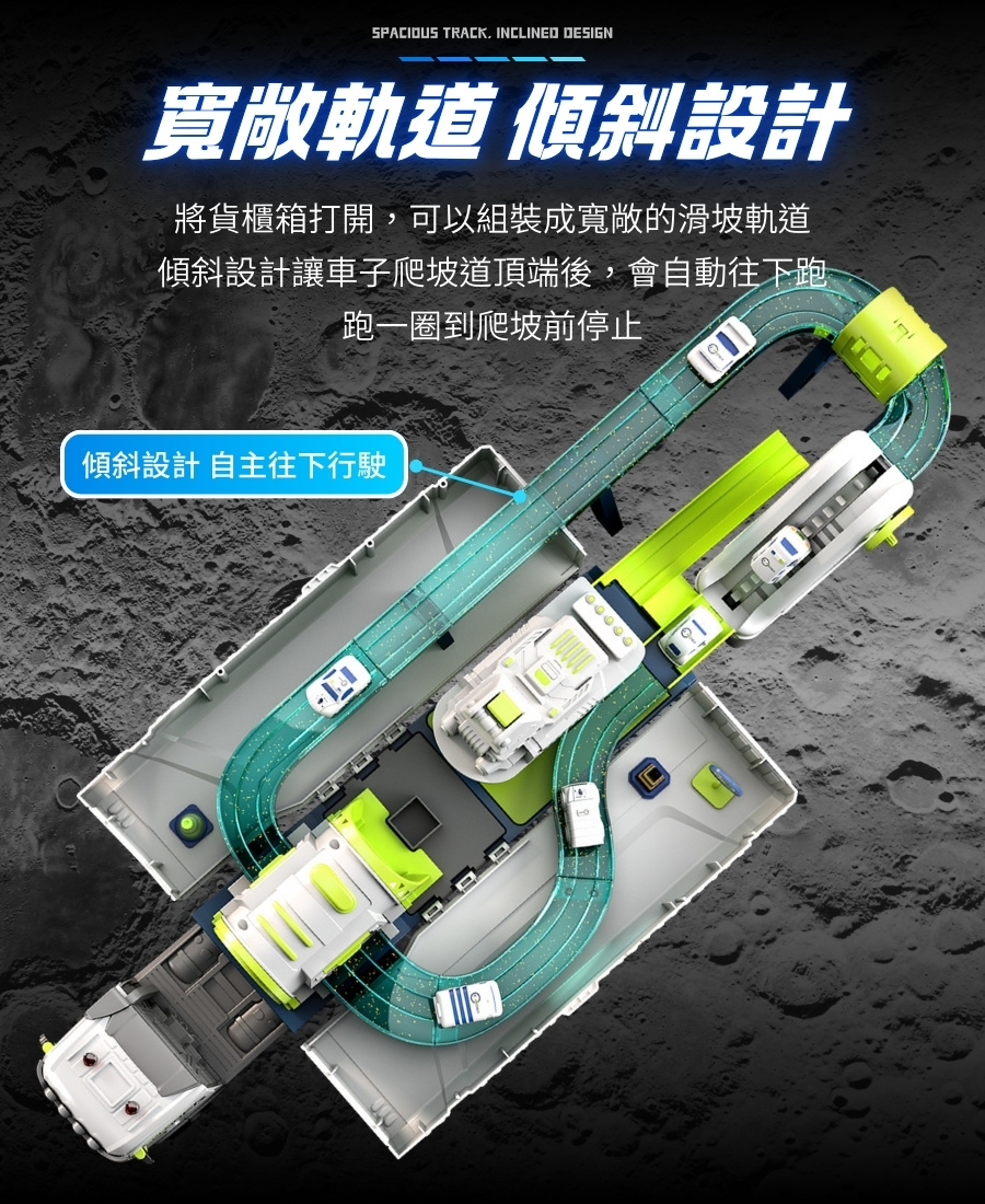 〝滑坡軌道:貨櫃打開可組裝成寬敞軌道、車子爬至頂端後會自動往下跑至坡前