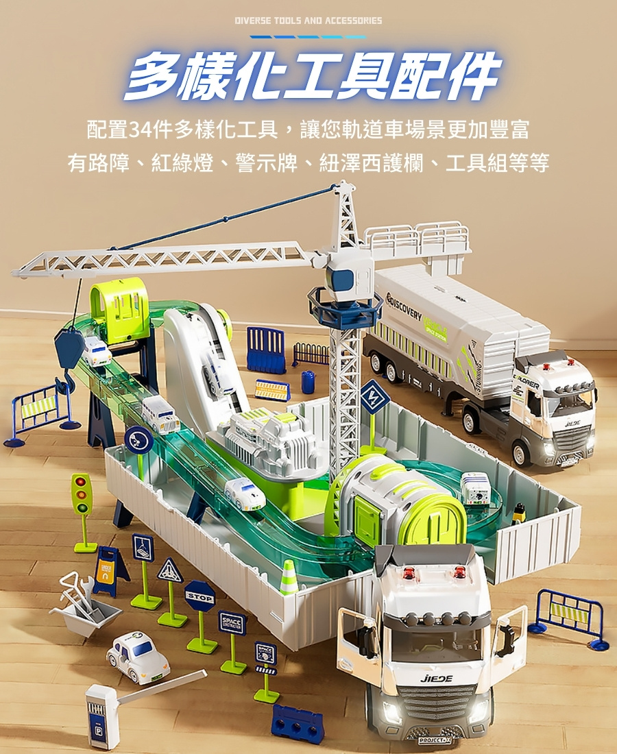 【多樣工具】 配置34種工具,有路燈、紅綠燈、警示牌、紐西蘭護欄、工具組等..