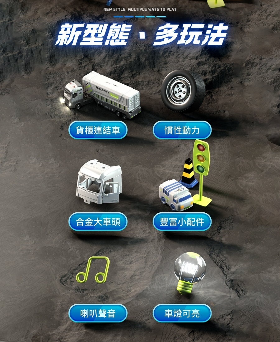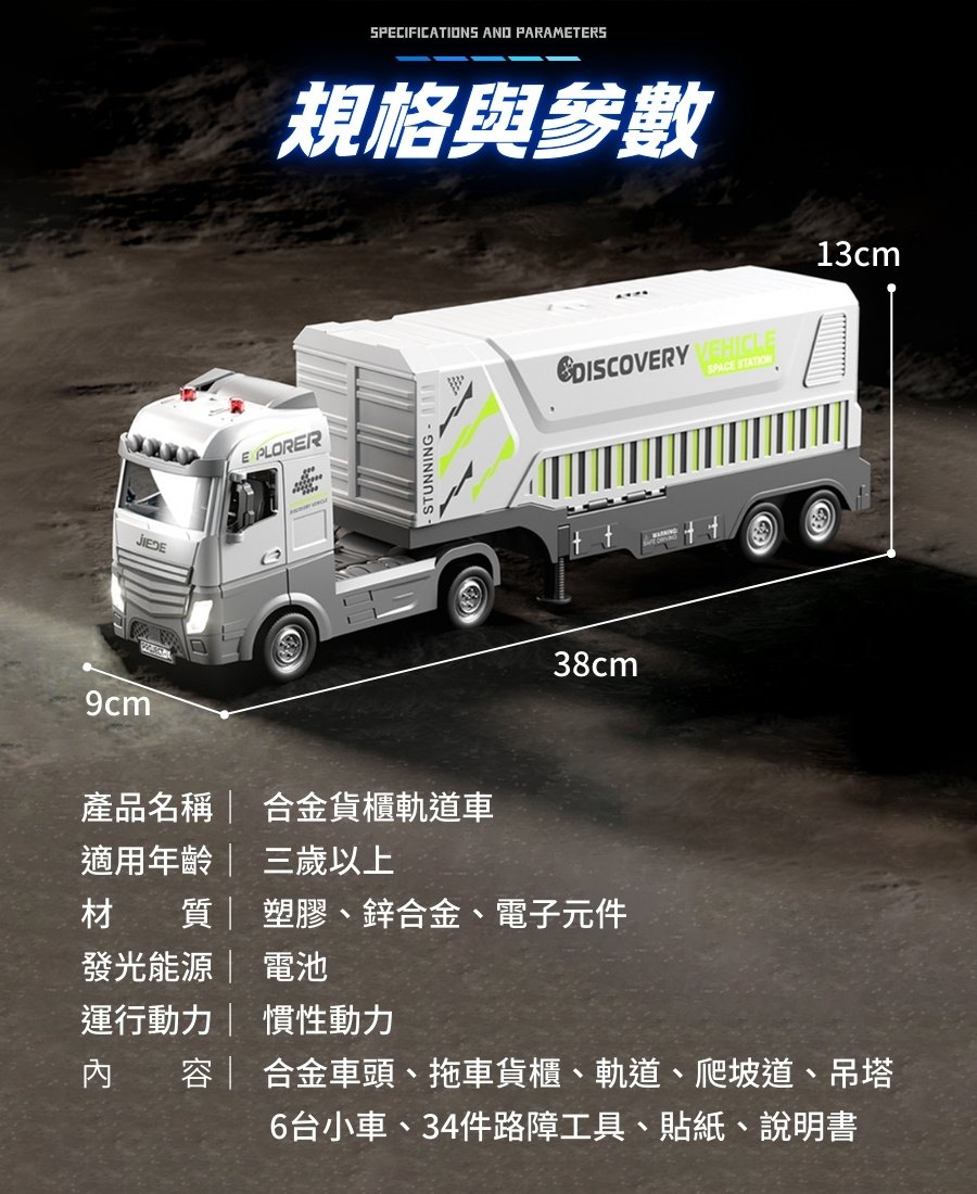 【內容】合金車頭、拖車貨櫃、軌道、爬坡道、吊塔、6台小車、34件路障工具、貼紙、說明書