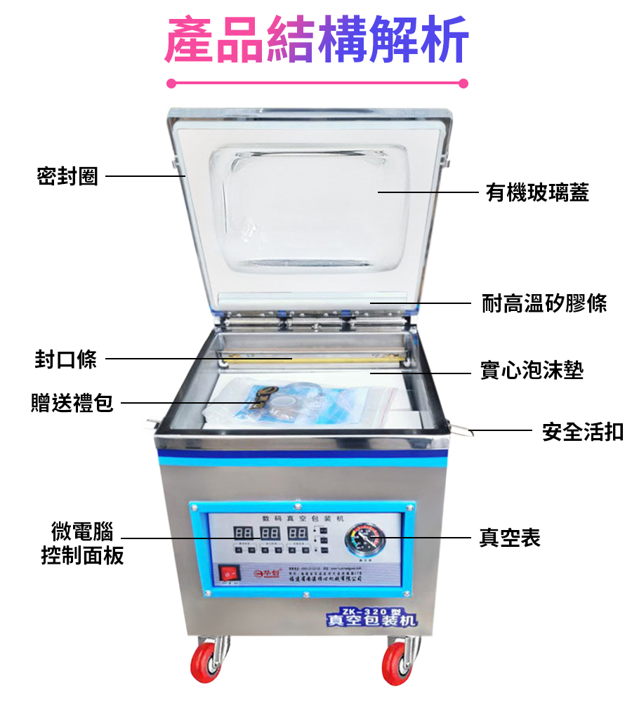 內容物:真空包裝機、真空袋數個、高溫膠布數個、加熱絲、實心氣泡墊、說明書