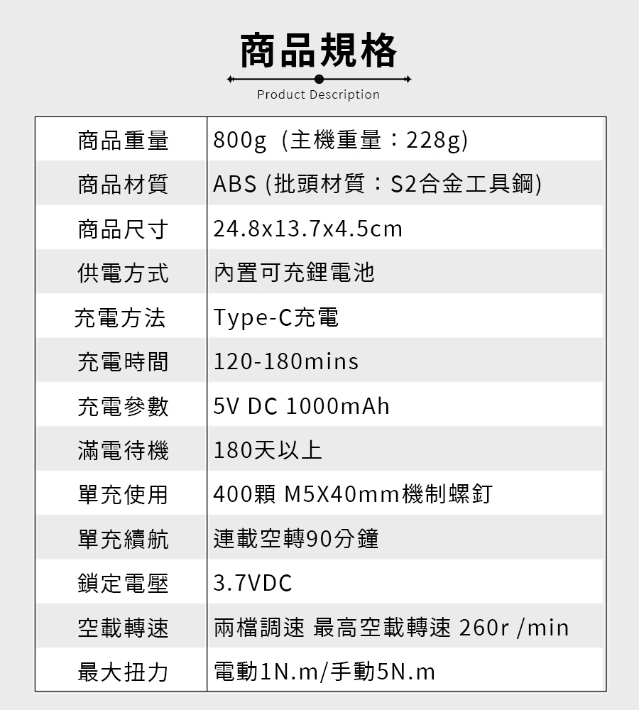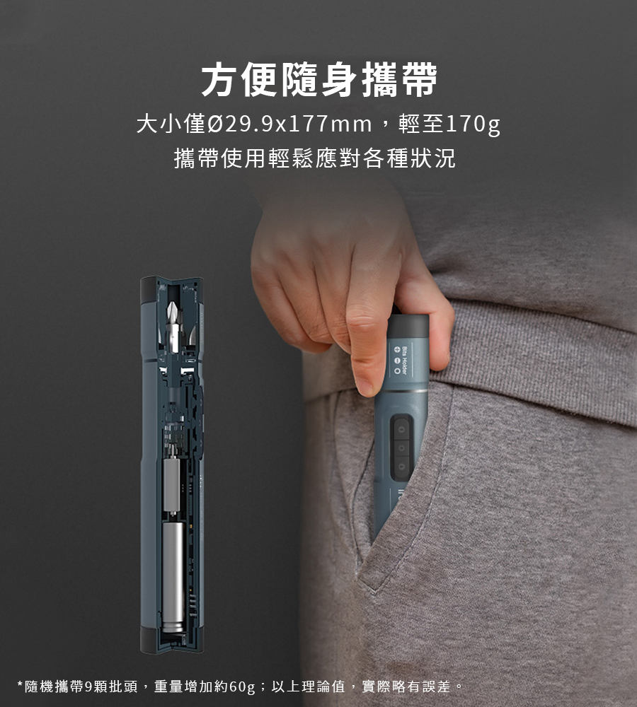 *隨機攜帶9顆批頭,重量增加約60g;以上理論值,實際略有誤差。