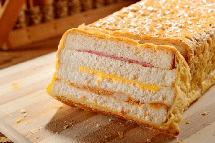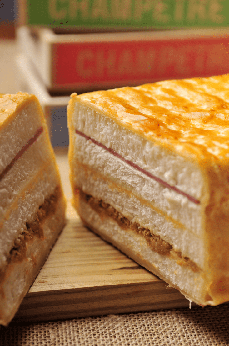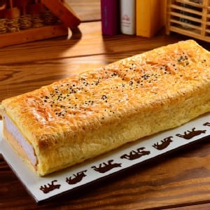 4.芋頭肉鬆起酥三明治:雞蛋、麵粉、糖、鹽、火腿、起司、牛奶土司、芋頭