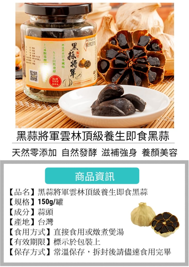 營養滿滿,滋補強身,養顏美容,促進新陳代謝,幫助維持消化道機能!只要輕輕撥開黑蒜頭膜即可食用!用來燉雞湯、排骨湯、炒菜、佐煎牛排也是美味無法擋。口感軟Q、香濃不嗆辣、微甜的口味讓人愛不釋手!強力推薦!