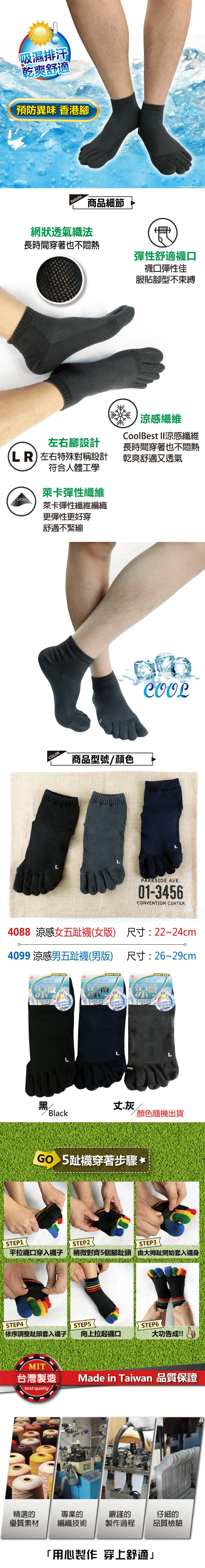 舒適乾爽涼感五趾襪,感受乾爽與舒適,五趾襪幫助你的腳趾分開,保持腳部乾爽,讓五隻腳趾都能輕鬆活動,指縫間不易沾附汗水、殘留熱氣,使用清涼節能纖維,吸濕排汗,透氣不悶熱,長時間穿著也舒舒服服,台灣製造,品質保證!