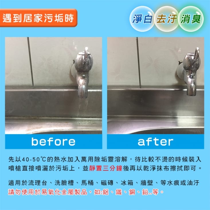 ※若有塗層、鍍膜等特殊材質之產品,使用前請參考製造商之清潔指示以避免損壞,勿使用於大理石、花崗石等需養護之石材類設備與鋁製品。