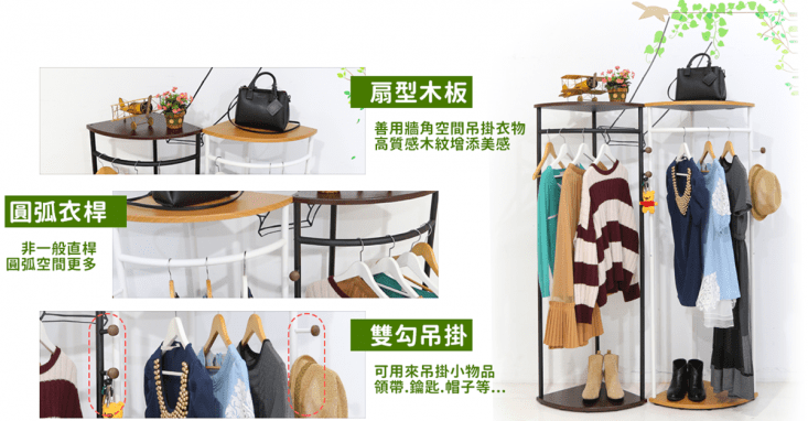 轉角多功能衣帽架吊衣架,有效運用角落收納,讓收納不再只侷限於平面了,讓角落也可以很好收!採用噴砂霧面烤漆與木製無印風格相互搭配,使空間更有美感~ 上下置物平台方便放好放滿,讓您輕鬆擺放包包、衣物或帽子!現在就來跟上角落收納的風潮吧~ ❤