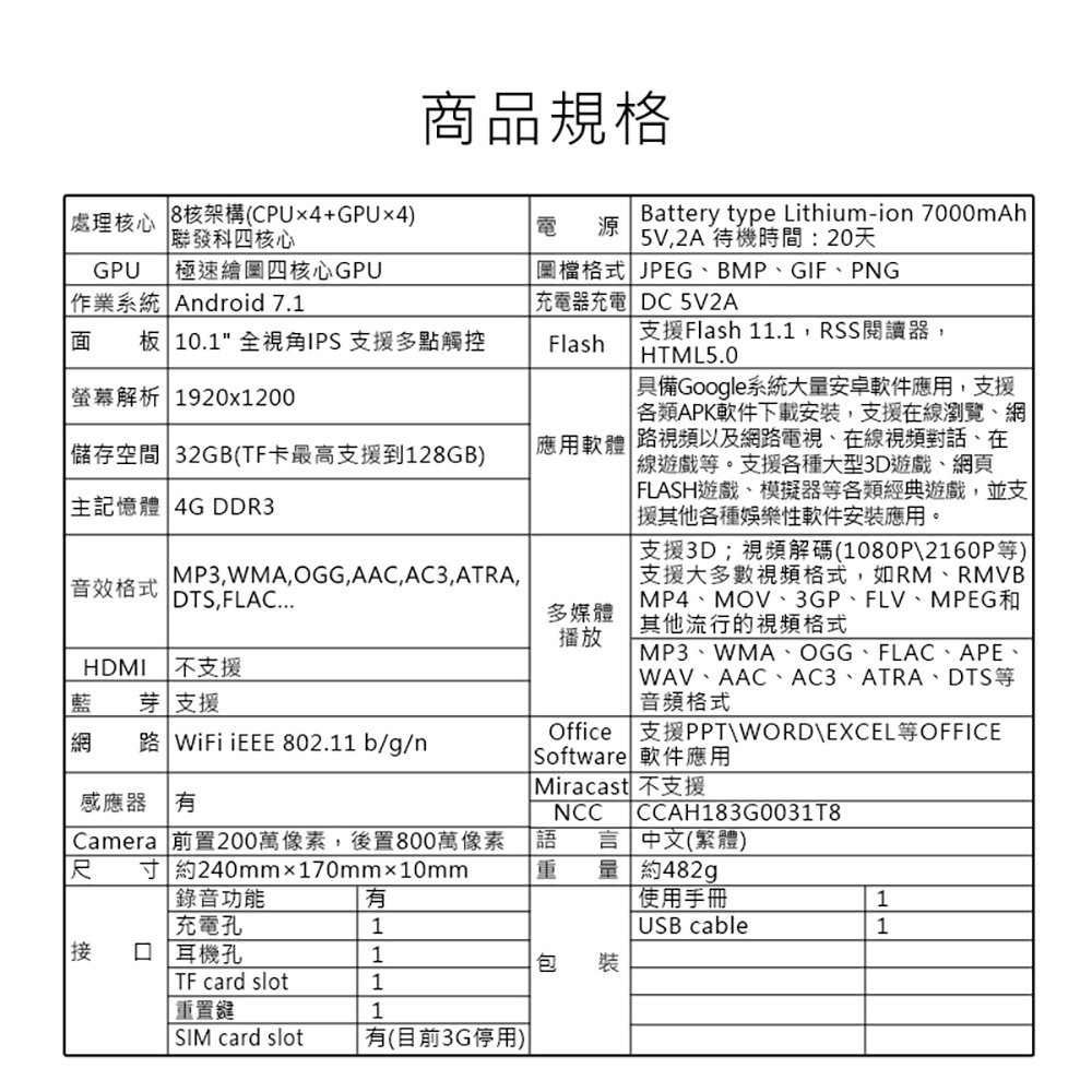 (豪華版)-平板x1、USB充電線x1、說明書x1、觸控筆x1、專用皮套x1、32GB TF卡x1、耳機x1