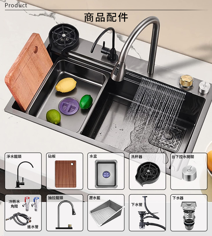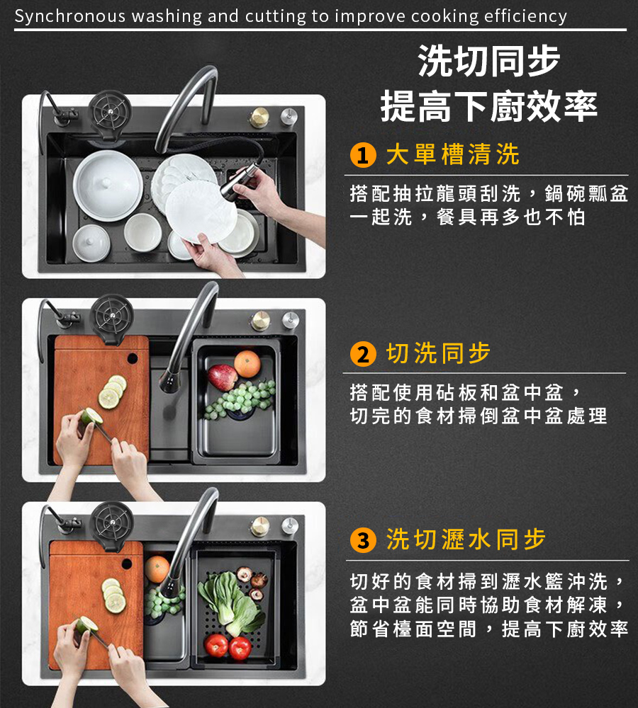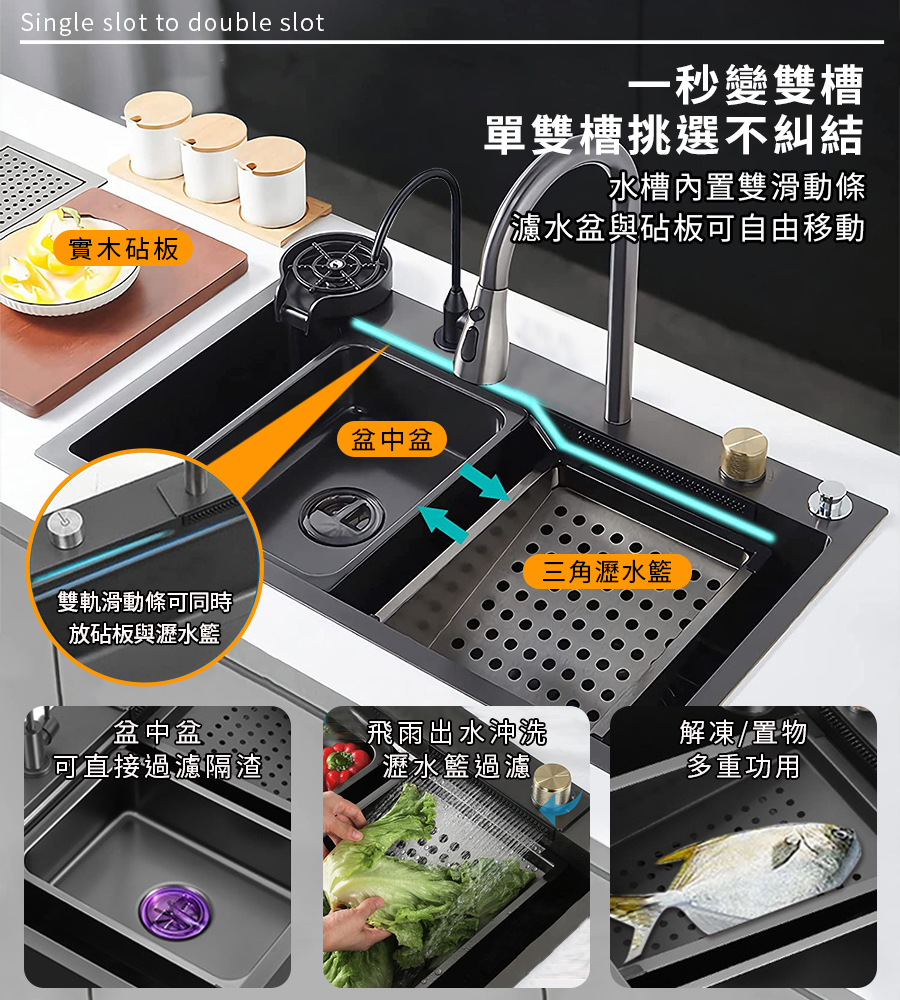 水槽內置雙軌滑動條 可同時放瀝水籃與砧板