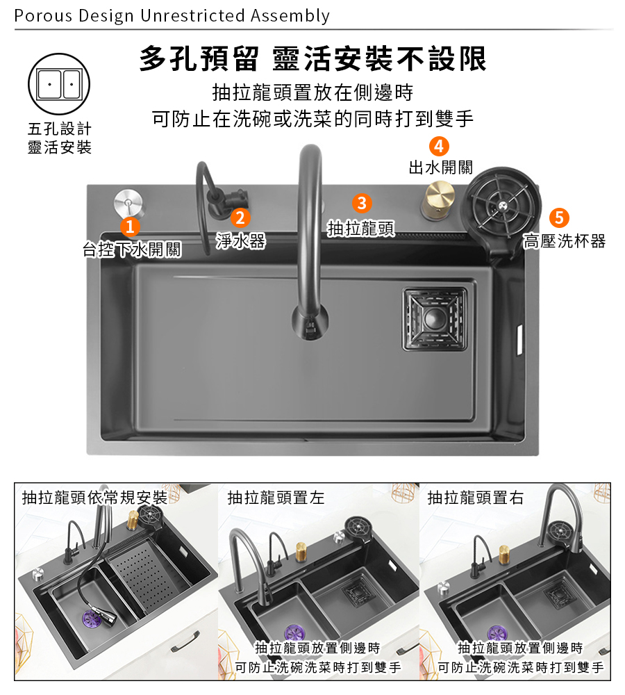 抽拉龍頭想置中、置左、置右,隨個人喜好來擺放