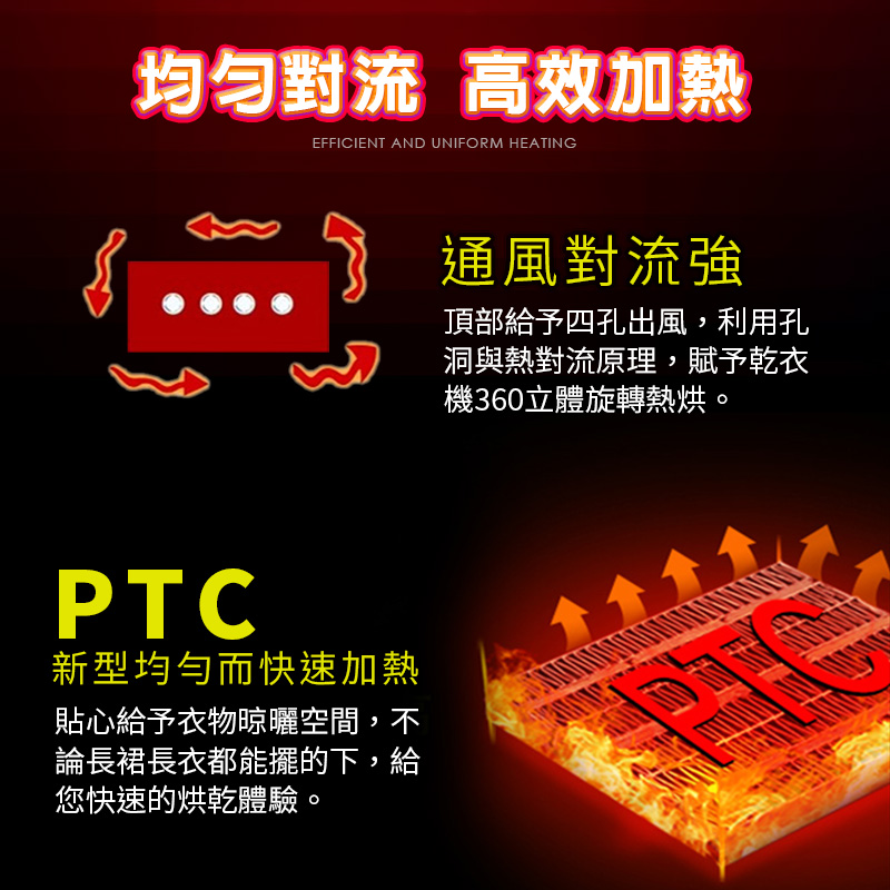 【瞬間加熱】 PTC新型360度迴轉送風,讓烘乾更全面,更快速