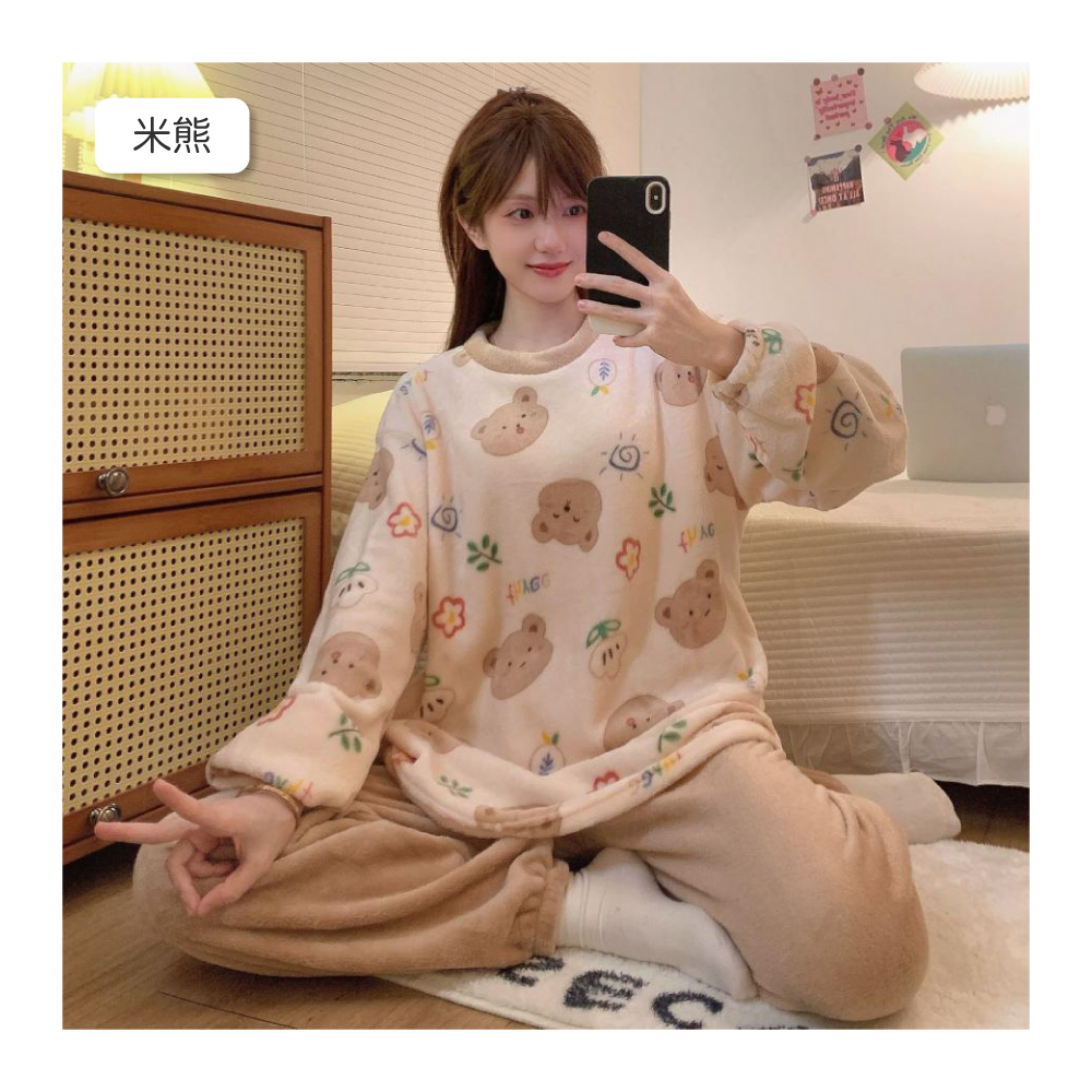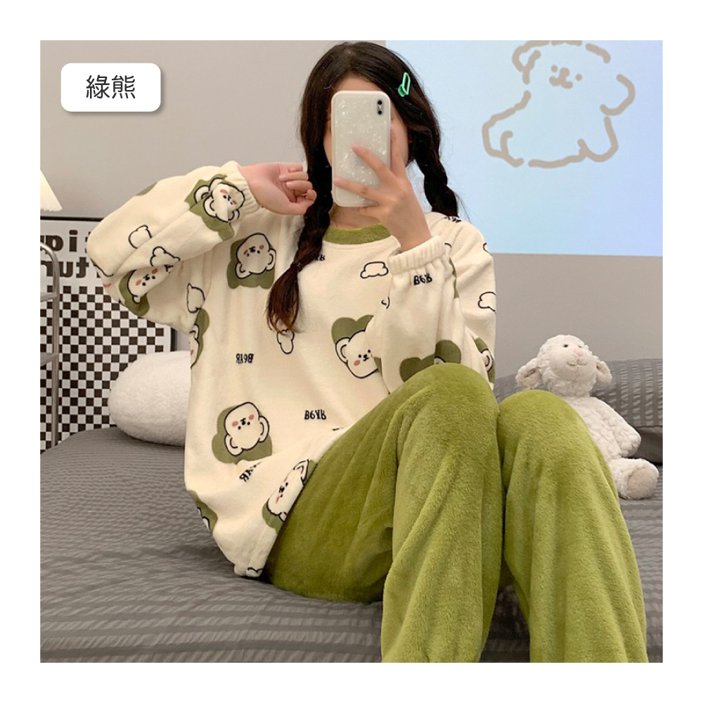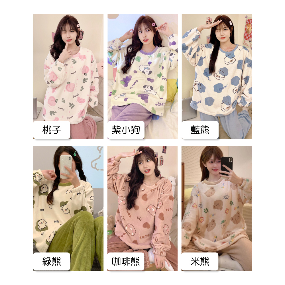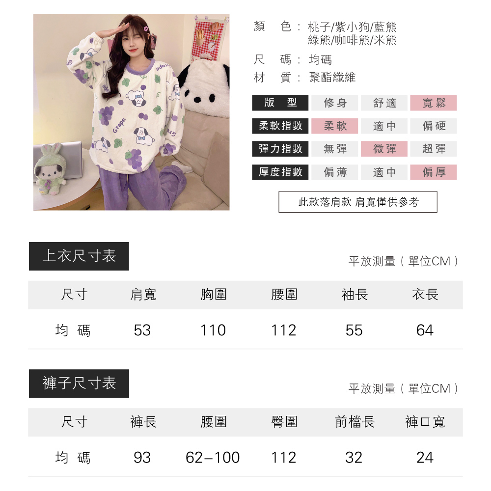 【商品名稱:親親動物系列珊瑚絨睡衣】【規格】選項 :桃子、紫小狗、綠熊、藍熊、米熊、咖啡熊規格 : 均碼產地 : 中國材質 : 100%聚酯纖維(滌綸)內容物與數量 : 上衣X1+褲子X1版型 : 正常