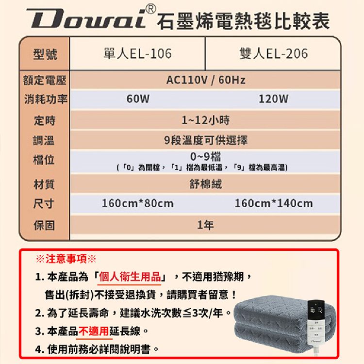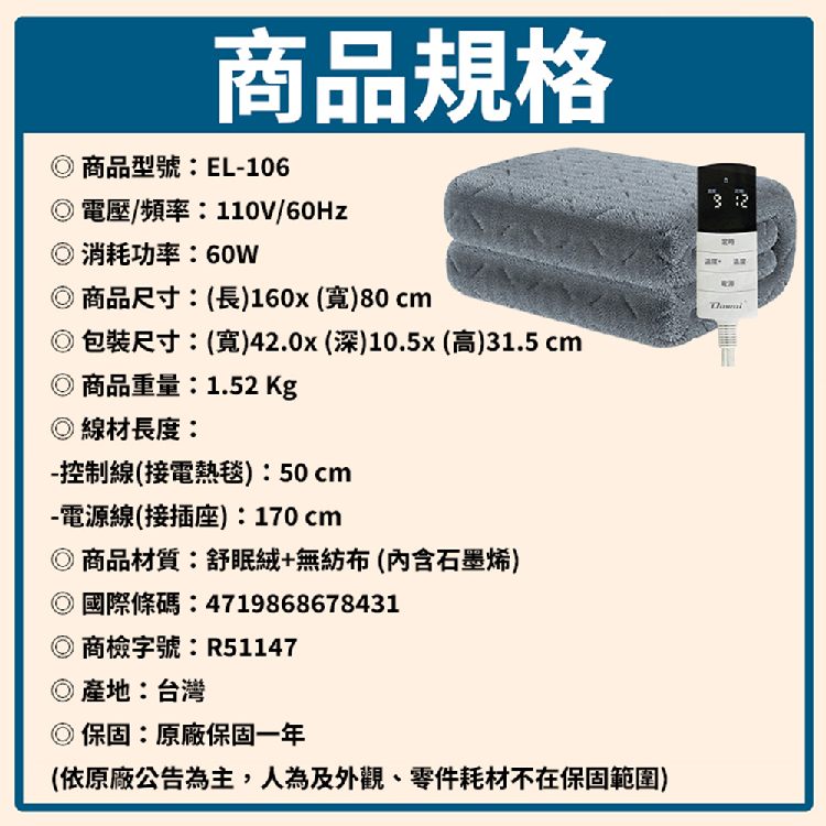 【商品名稱:微電腦單人石墨烯電熱毯】
